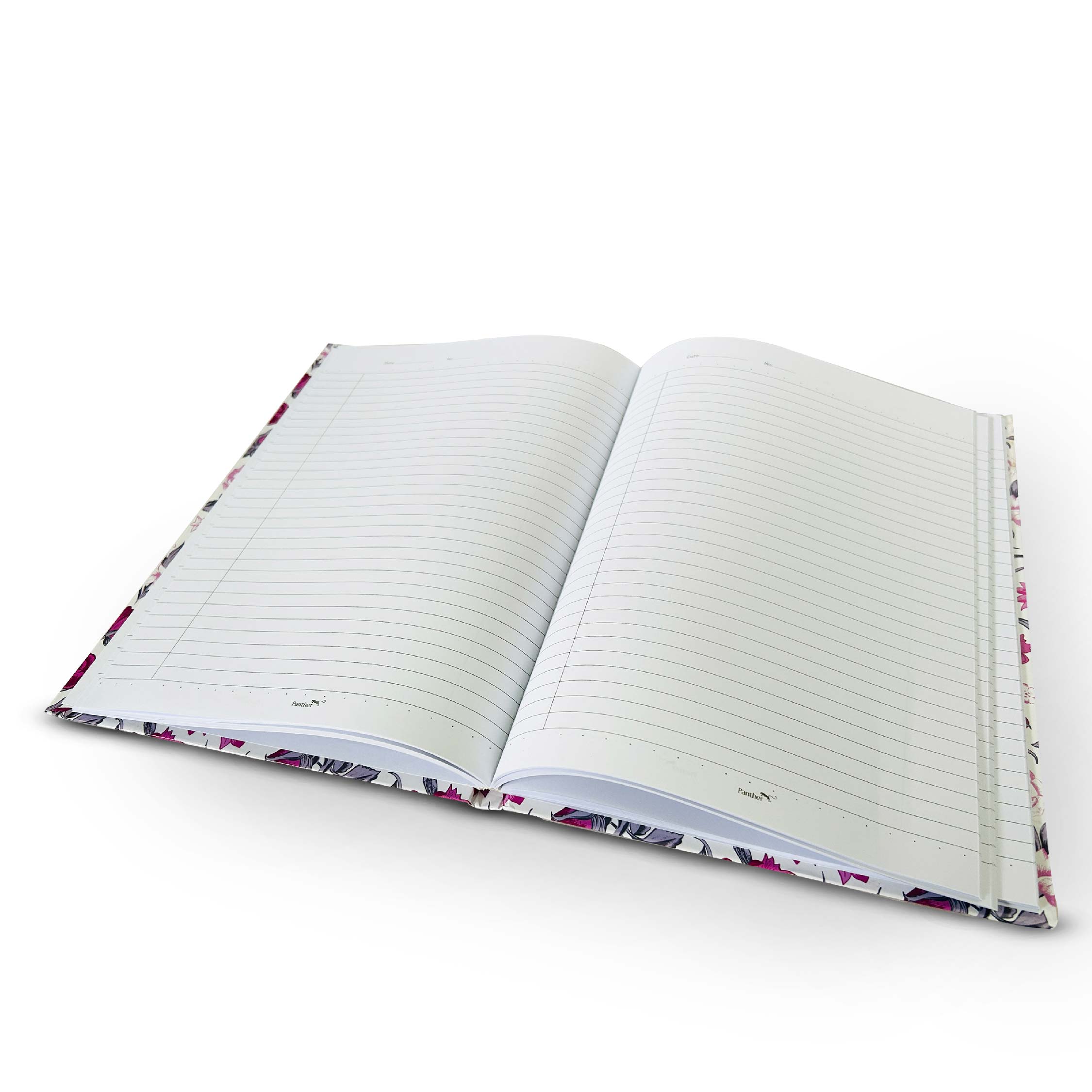 The sturdy hardcover, featuring a pink and purple design, protects your pages while adding a polished and eye-catching look. Its robust construction ensures long-lasting use, making it ideal for school, office, or personal projects.