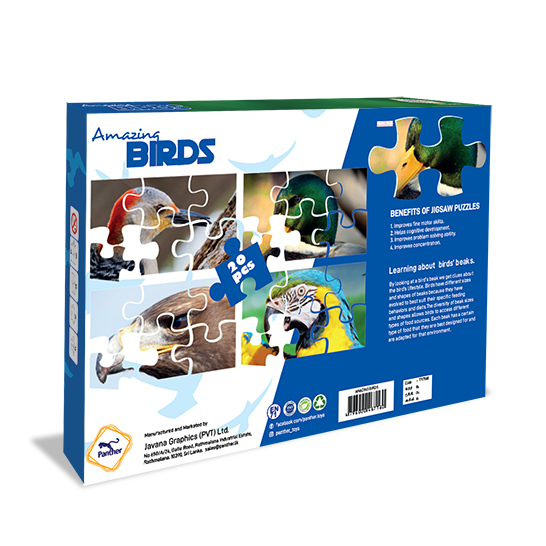 Introducing Panther Amazing Birds Jigsaw Puzzle, an enchanting educational activity that brings the beauty of birds to life. This captivating puzzle set features four stunning real-life images of popular birds from around the world. With each puzzle consisting of 20 expertly crafted pieces, children will embark on a delightful journey of exploration and discovery.