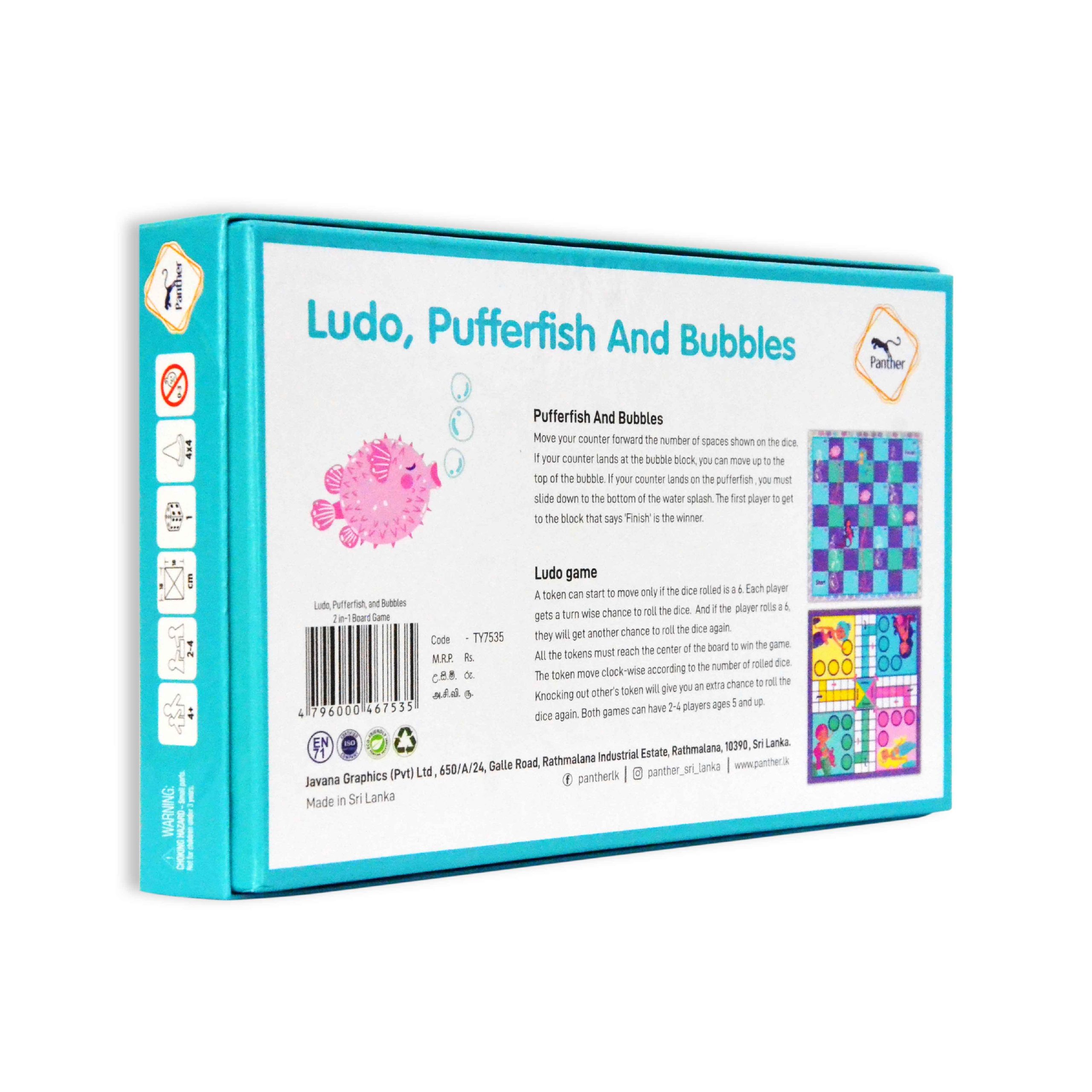 Experience the magic of two beloved games in one with Panther’s “Ludo, Pufferfish, and Bubbles 2-in-1 Board Game.” Dive in, roll the dice, and embark on a journey filled with laughter, strategy, and plenty of fun for players aged 4 and above.