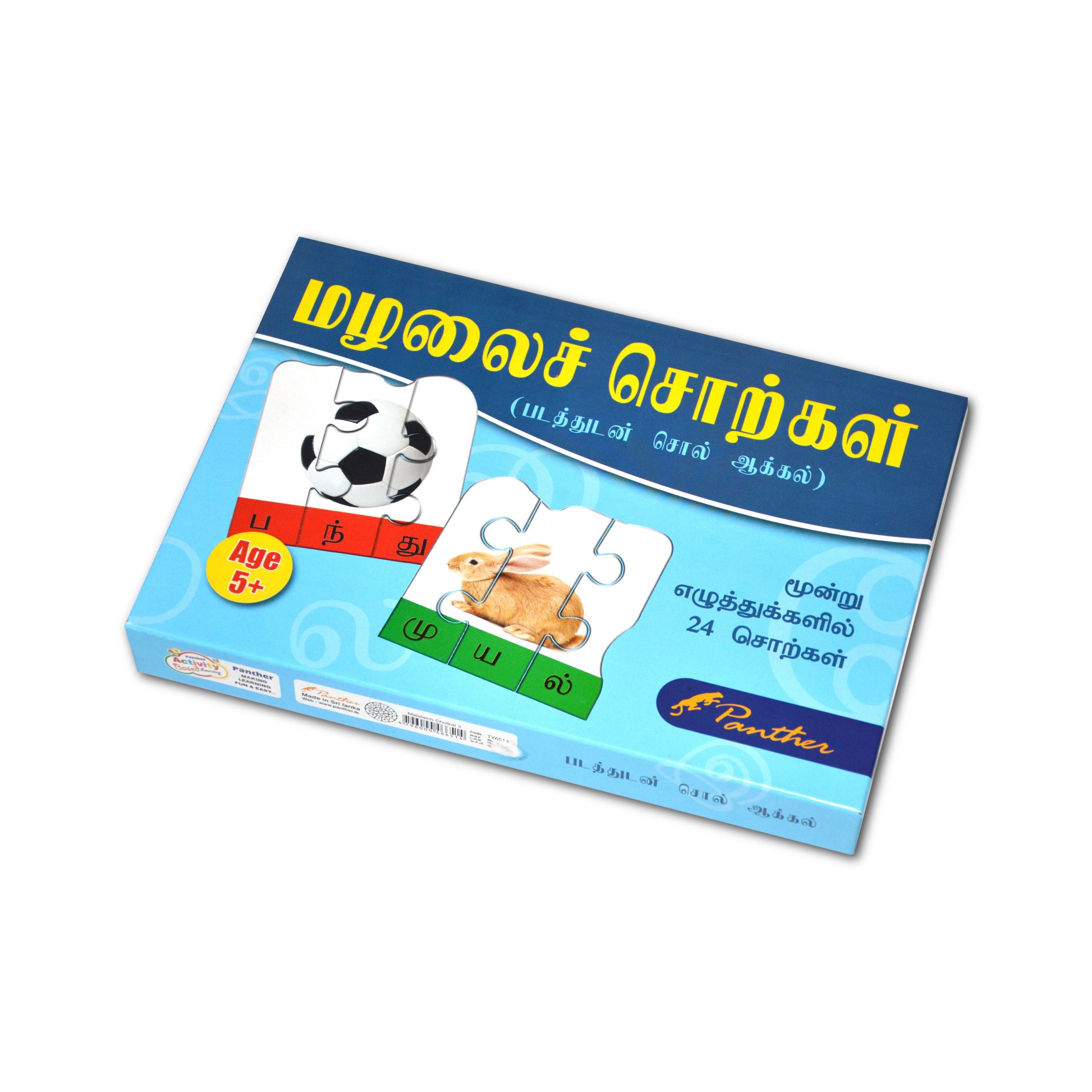 Panther Malalaich Chotkal 3 is a simple word building exercise, once the child has been introduced to the Tamil alphabet, they would proceed to construct simple 2 and 3 letter words. The words chosen for this box consist of only simple letters. The child is given a hint where the image of the word is displayed at the top of the puzzle and the words is printed in black on a unique color band to ensure the exercise doesn’t become complicating and frustrating for the child. The box consists of 24 sets of words, where each puzzle has 3 letters each. This product is exported to Singapore. The ink, glue, board and paper have cleared the safety levels, where it is safe for a child to play with.