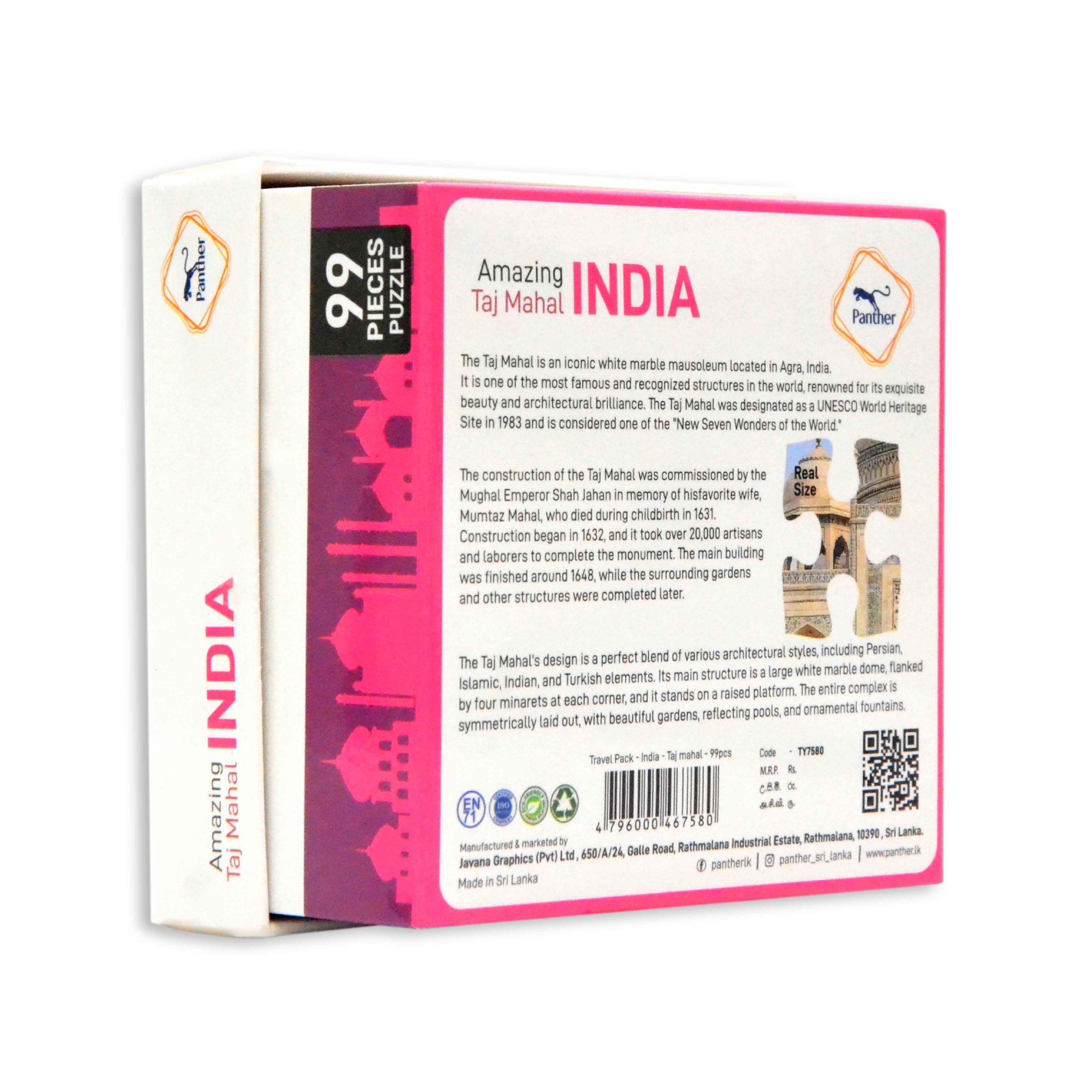 Introducing the latest masterpiece from Panther, the Travel Pack – India – Taj Mahal – 99 Pieces Puzzle! Immerse yourself in the breathtaking beauty of India with this mesmerizing puzzle that promises hours of entertainment and a journey through one of the world’s most iconic landmarks.