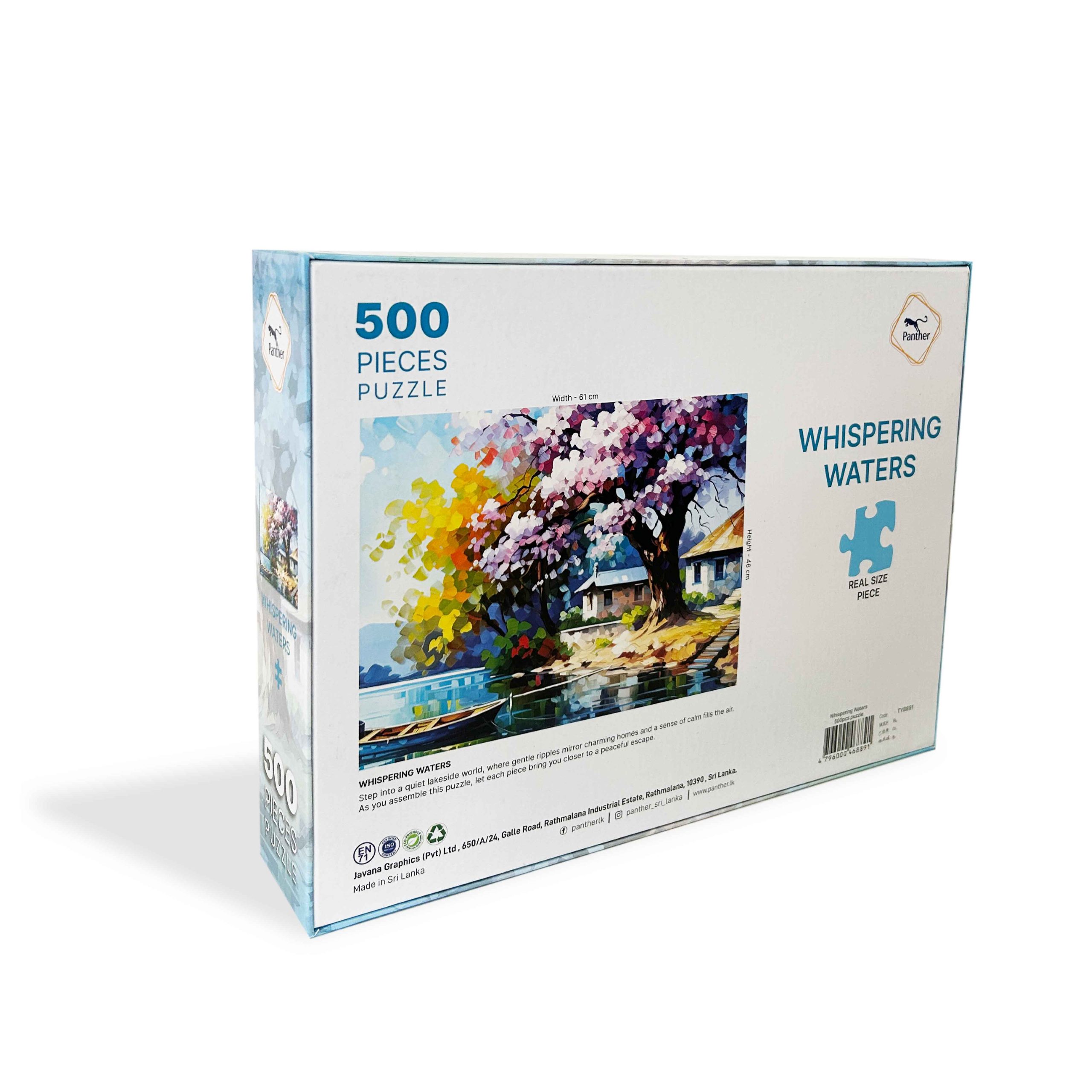 Step into a serene lakeside escape with Panther’s Whispering Waters – 500 Pieces Puzzle. Inspired by the peaceful charm of a quiet waterfront village, this puzzle captures a soothing scene where gentle ripples shimmer across the lake and cozy homes reflect beautifully on the water’s surface. Each piece brings you closer to a world of calm, making it the perfect retreat for anyone who loves scenic landscapes and mindful relaxation.
